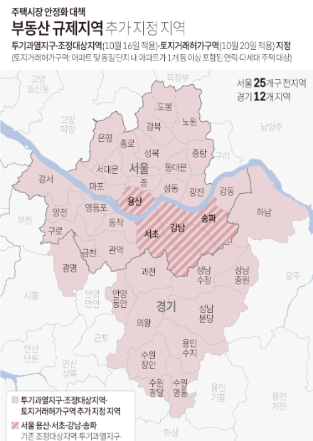 - 삼중 규제 동시 적용: 서울 전역 + 경기 12곳에 조정대상지역·투기과열지구·토지거래허가구역 일괄 지정.